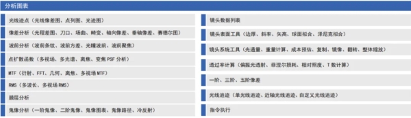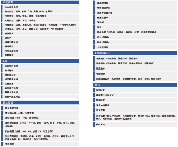 軟件中的工具部件都與設計過程中的重要步驟相符合,從而構成了軟件中的基礎功能。其中分析、優化和公差工具包含了一系列特定公差內基于物理算法的分析、仿真、以及優化光學系統。