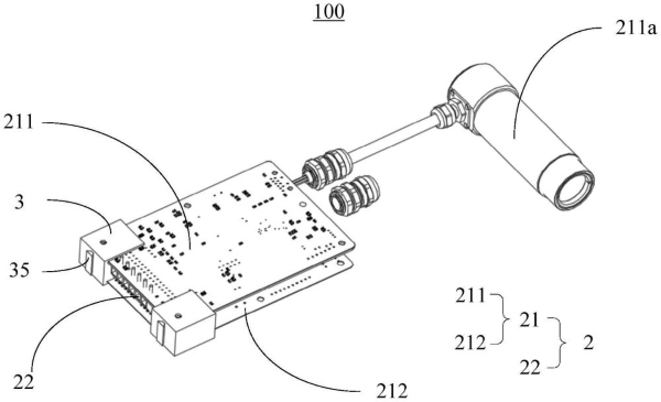 電路板組件:包括多個沿上下向間隔排布的板體和對應板體間隔設置的至少一個雙排針,板體和雙排針位于容置腔內,各雙排針用以電連接相鄰的各板體。該組件還設有紅外測溫模塊和反饋驅動模塊,紅外測溫模塊的部分設于一板體處,反饋驅動模塊的部分設于與之相鄰的另一板體處。